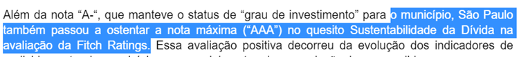 O município, inclusive, recebeu rating AAA pela agência Fitch na categoria “Sustentabilidade das dívidas”, que é o mais alto nível que existe no que diz respeito às avaliações de crédito: