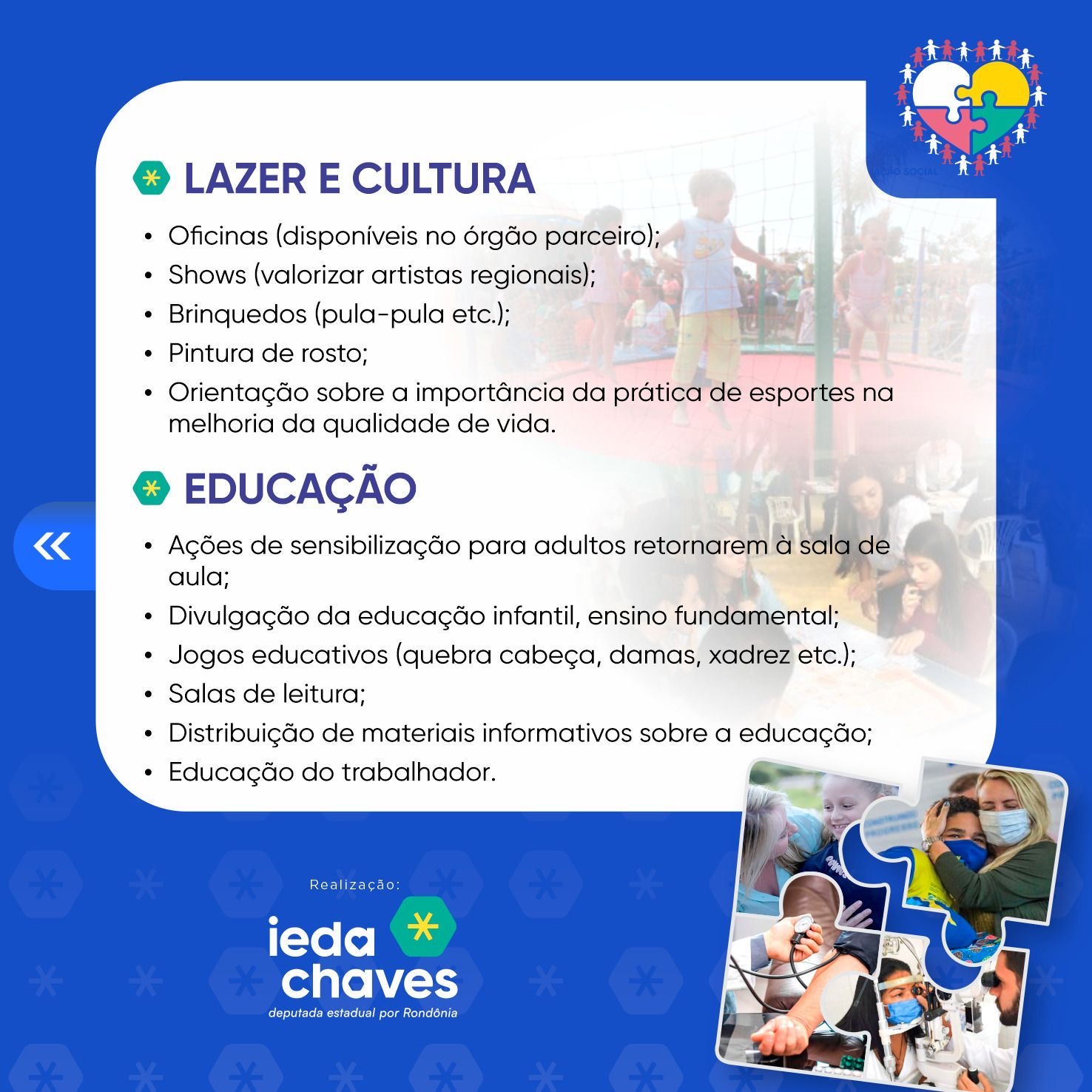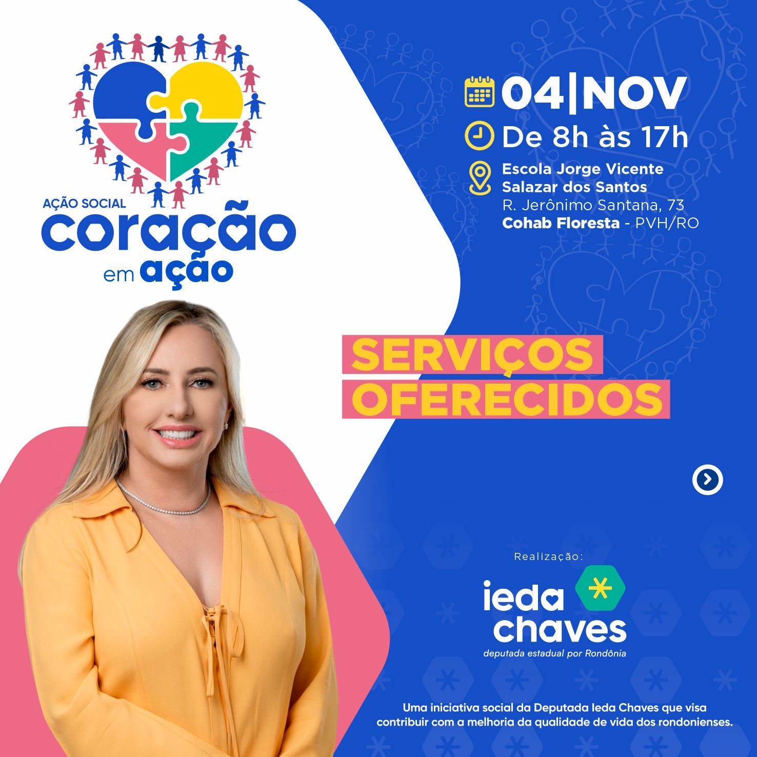 Neste sábado (4), a partir das 08h, na Escola Jorge Vicente Salazar dos Santos, localizada na rua Jerônimo Santana, número 73, bairro Cohab acontece a ação realizada pela deputada estadual e primeira-dama do município, Ieda Chaves, ‘Coração em ação’.