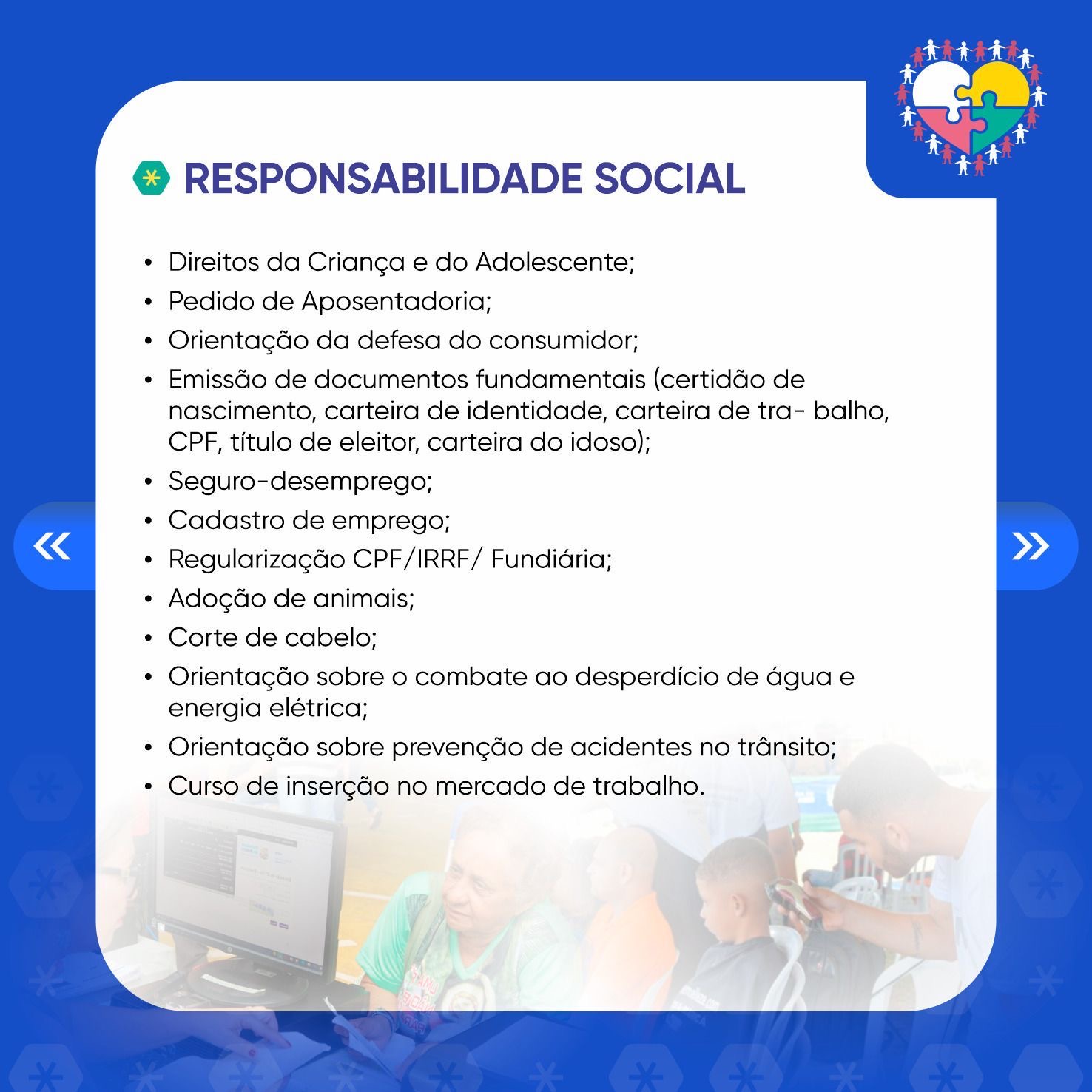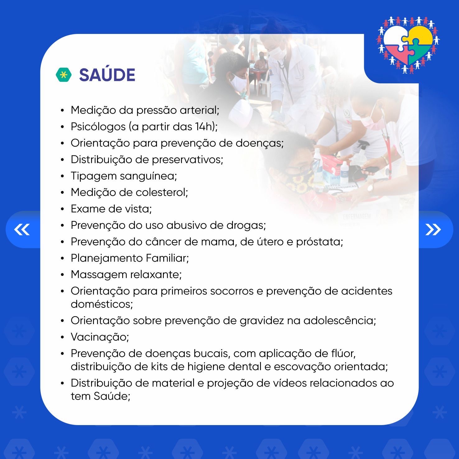 Facilitando o acesso da comunidade aos serviços, a Secretaria Municipal de Saúde (Semusa) também estará presente na ação social, com aferição de pressão e testes de glicemia, distribuição de preservativos, planejamento familiar, vacinação, atendimento médico com clínico geral, escovação e distribuição de kits de higiene dental, palestras sobre prevenção de câncer de mama, câncer do colo do útero e gravidez na adolescência.