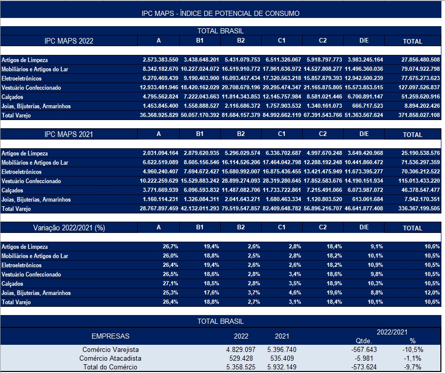 Na contramão desse consumo em recuperação, destaca-se a queda na quantidade de comércios varejistas e atacadistas no País. Segundo o IPC Maps, dos 5.932.149 estabelecimentos do segmento existentes em 2021, mais de 573 mil fecharam suas portas, totalizando atualmente 5.358.525 unidades instaladas no Brasil.