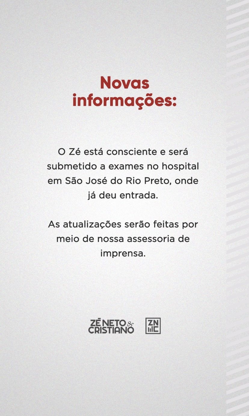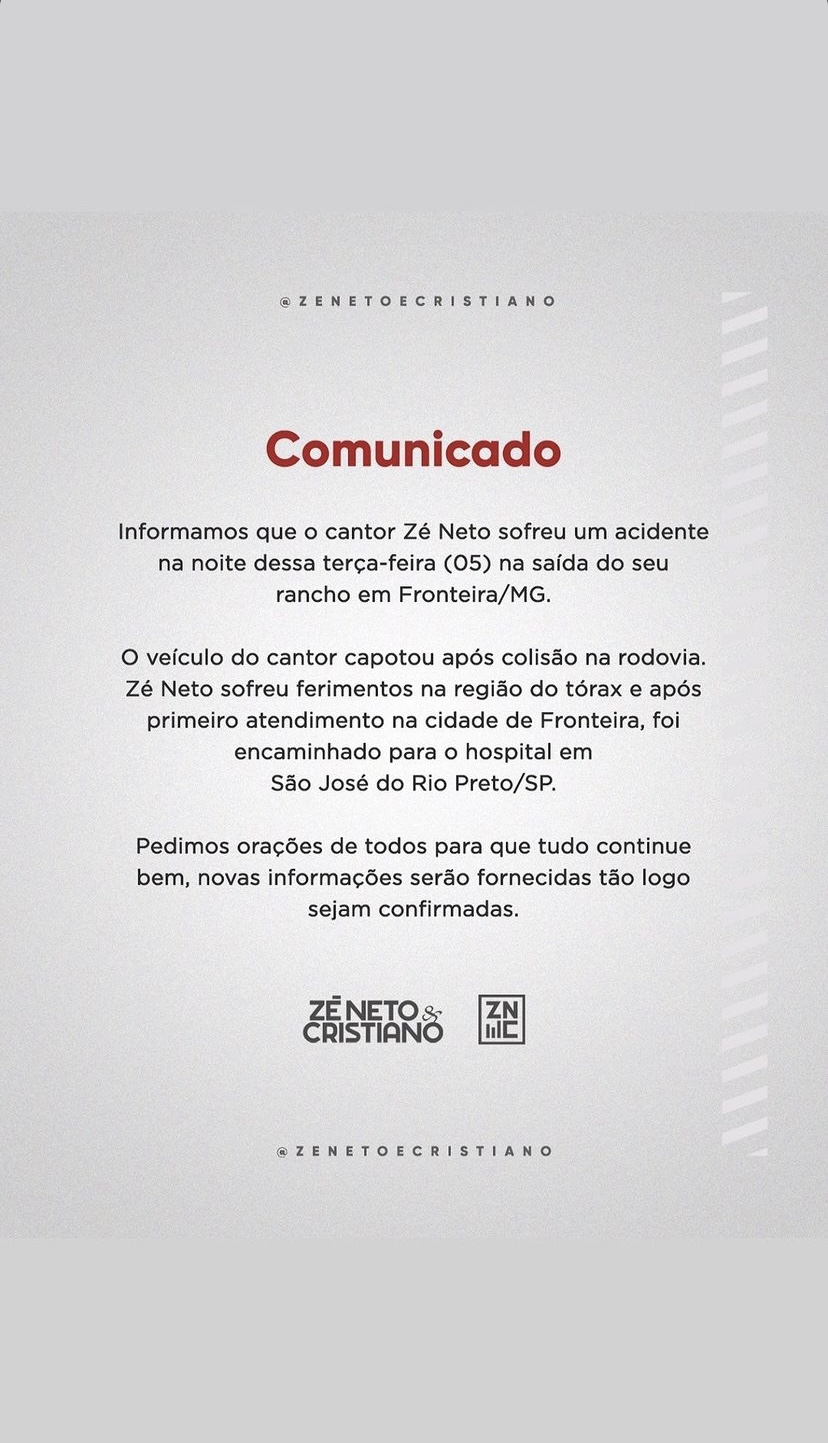 Através de redes sociais, a assessoria da dupla sertaneja, Zé Neto & Cristiano, se manifestou sobre acidente em que o cantor Zé Neto sofreu na noite desta terça-feira (5).