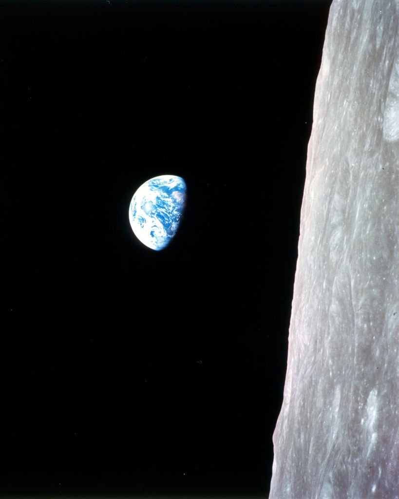 Em uma das órbitas lunares, Anders capturou uma foto da Terra azul brilhante em meio a vasta escuridão do espaço, com a superfície de crateras da Lua em primeiro plano.
