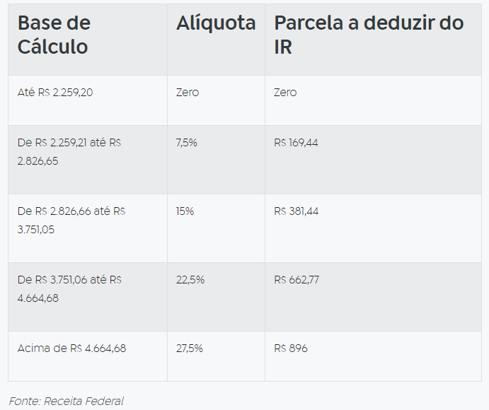 Confira a tabela progressiva mensal do IRPF, já com o desconto aplicado ao salário: