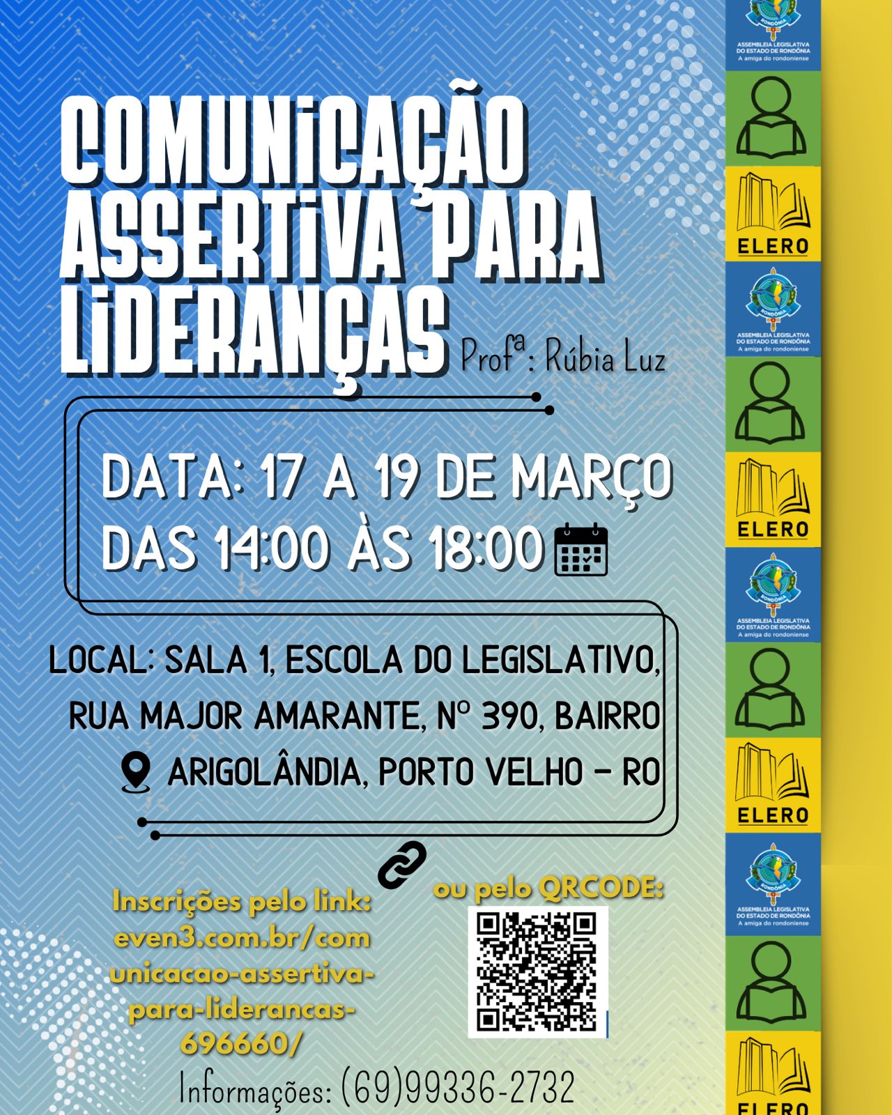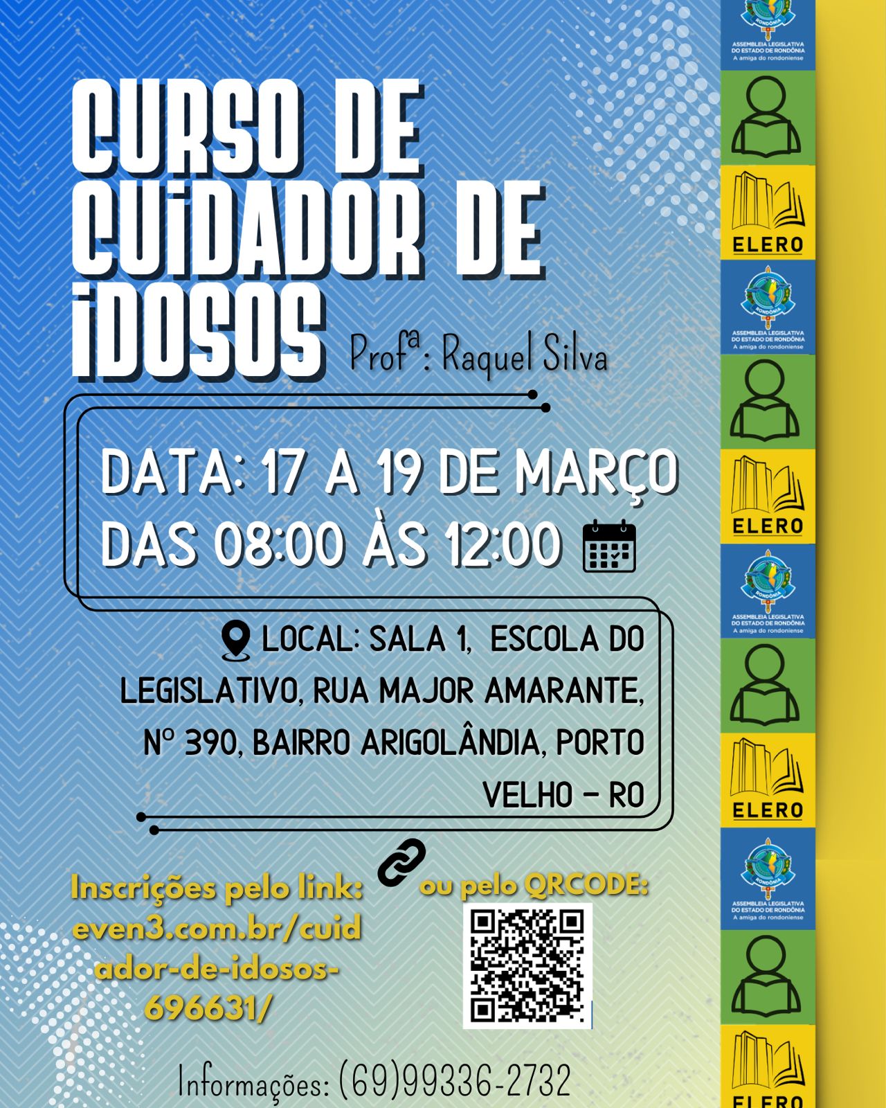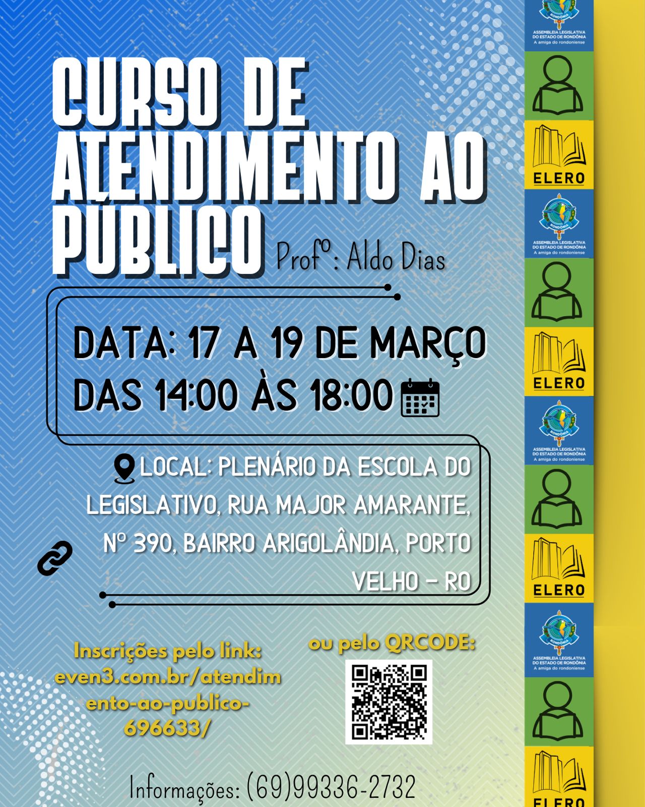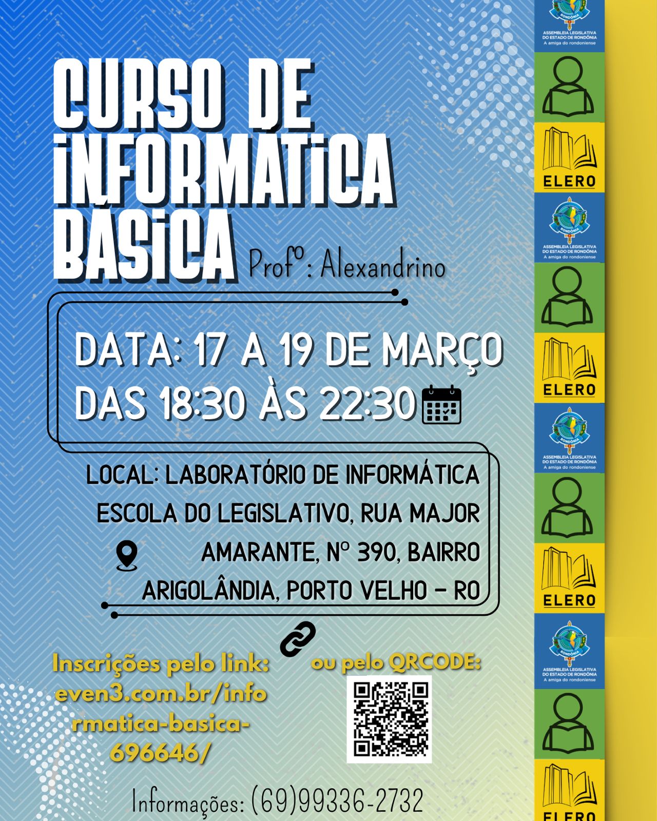 Os interessados devem acessar o perfil oficial da Elero no Instagram, onde estão disponíveis os QR Codes correspondentes a cada curso, garantindo uma inscrição rápida e prática. O cidadão interessado também pode acessar o site institucional da Alero em https://escola.al.ro.leg.br ou ir pessoalmente na sede da escola.