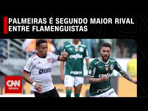 Apesar de serem de estados diferentes, o Palmeiras foi apontado como o segundo maior rival para a torcida do Flamengo, ficando atrás apenas do Vasco da Gama, segundo o levantamento do Maior Raio-X do Torcedor, feito pela CNN/Itatiaia/Quaest. #CNNBrasil