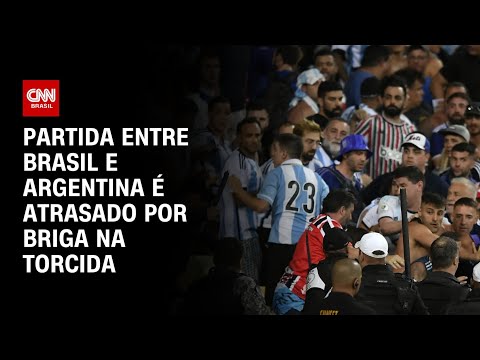 O jogo entre Brasil e Argentina é atrasado devido a uma briga generalizada na arquibancada. A confusão teria começado quando alguns torcedores brasileiros vaiaram o hino da Argentina, o que gerou indignação por parte dos argentinos. #CNNBrasil
