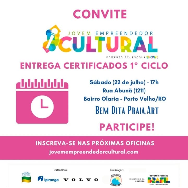Neste sábado (22), o projeto ‘Jovem Empreendedor Cultural’ fará um encontro de encerramento das atividades do primeiro ciclo das oficinas, às 17h, no espaço cultural Bem Dita Praia Art, em Porto Velho. O evento será realizado com o intuito de apresentar todo o aprendizado adquirido pelos alunos durante as oficinas.