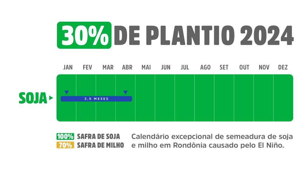 Em outras regiões, que representam 30% da área de produção a exemplo de Porto Velho e Nova Mamoré, a dilatação do prazo para semeadura de soja permitiu que o produtor esperasse um pouco mais. Nessas regiões, o processo ocorreu na segunda quinzena do mês de dezembro e primeira quinzena de janeiro, época em que houve mais registros de chuva, enquanto as primeiras plantações (aquelas que compõem os 70% de área plantada) começaram no final de outubro.