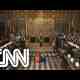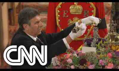 Confira o momento no qual os objetos símbolos da monarquia – a coroa imperial do Estado, o bastão e o globo que representa a monarquia britânica...
